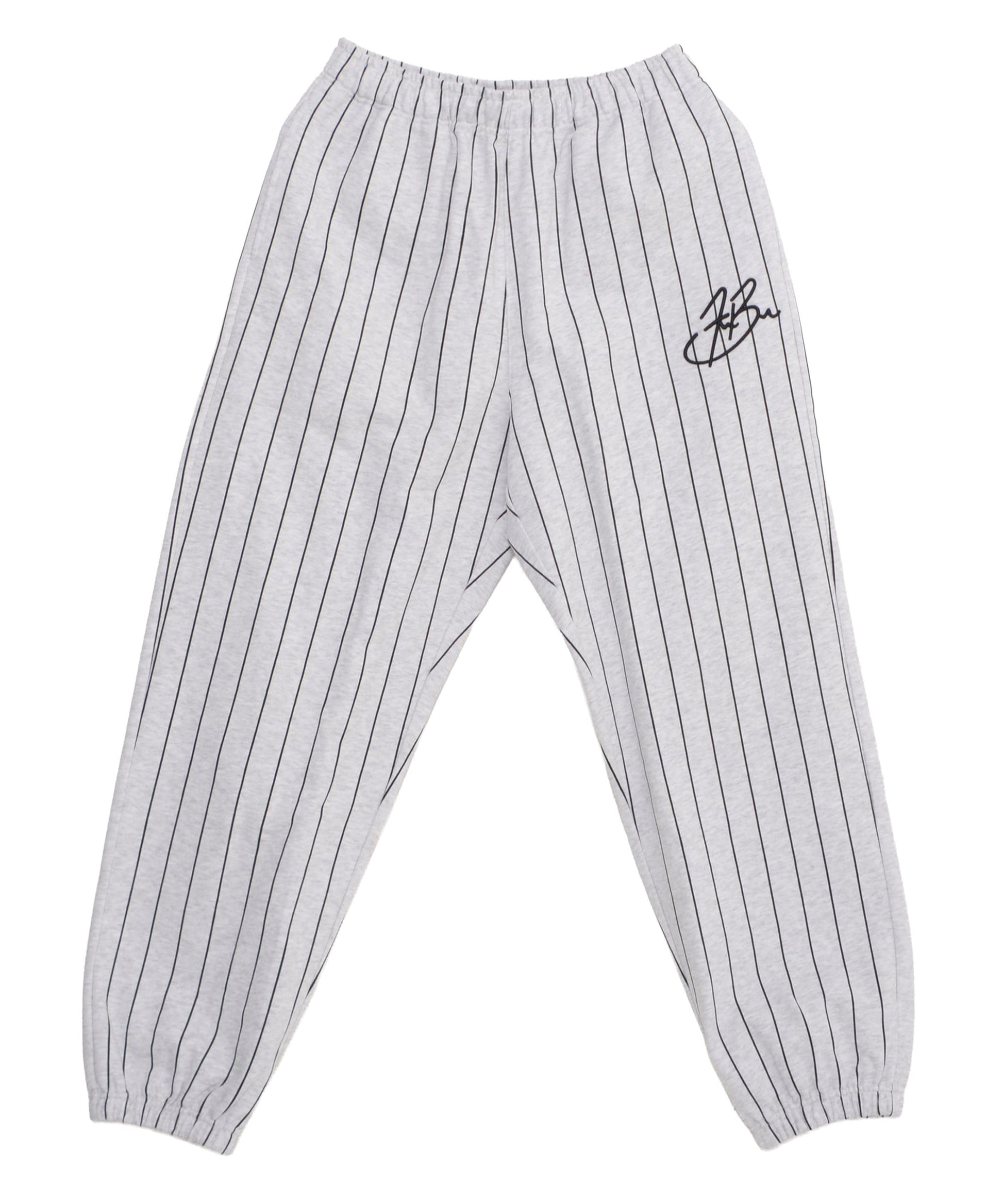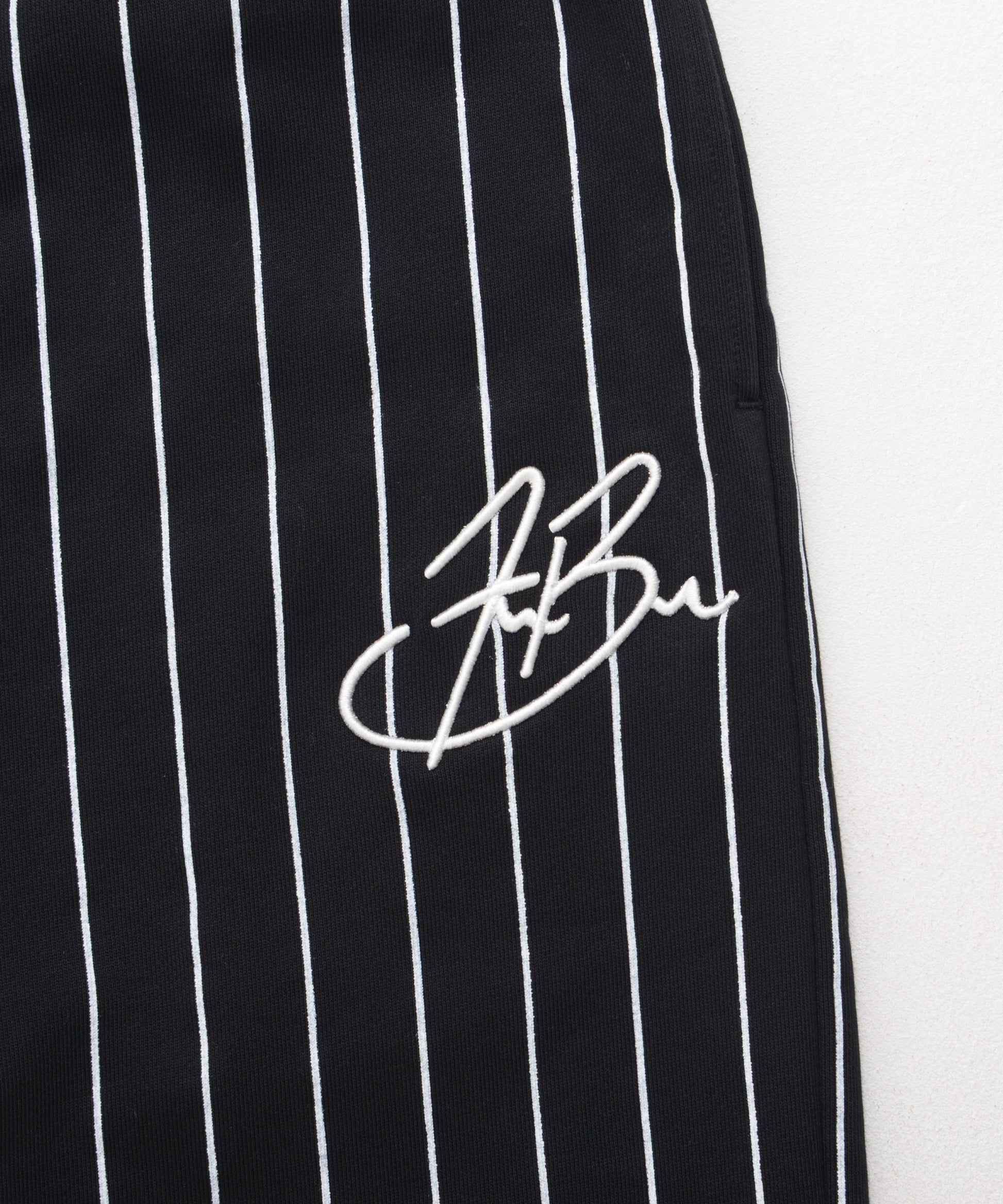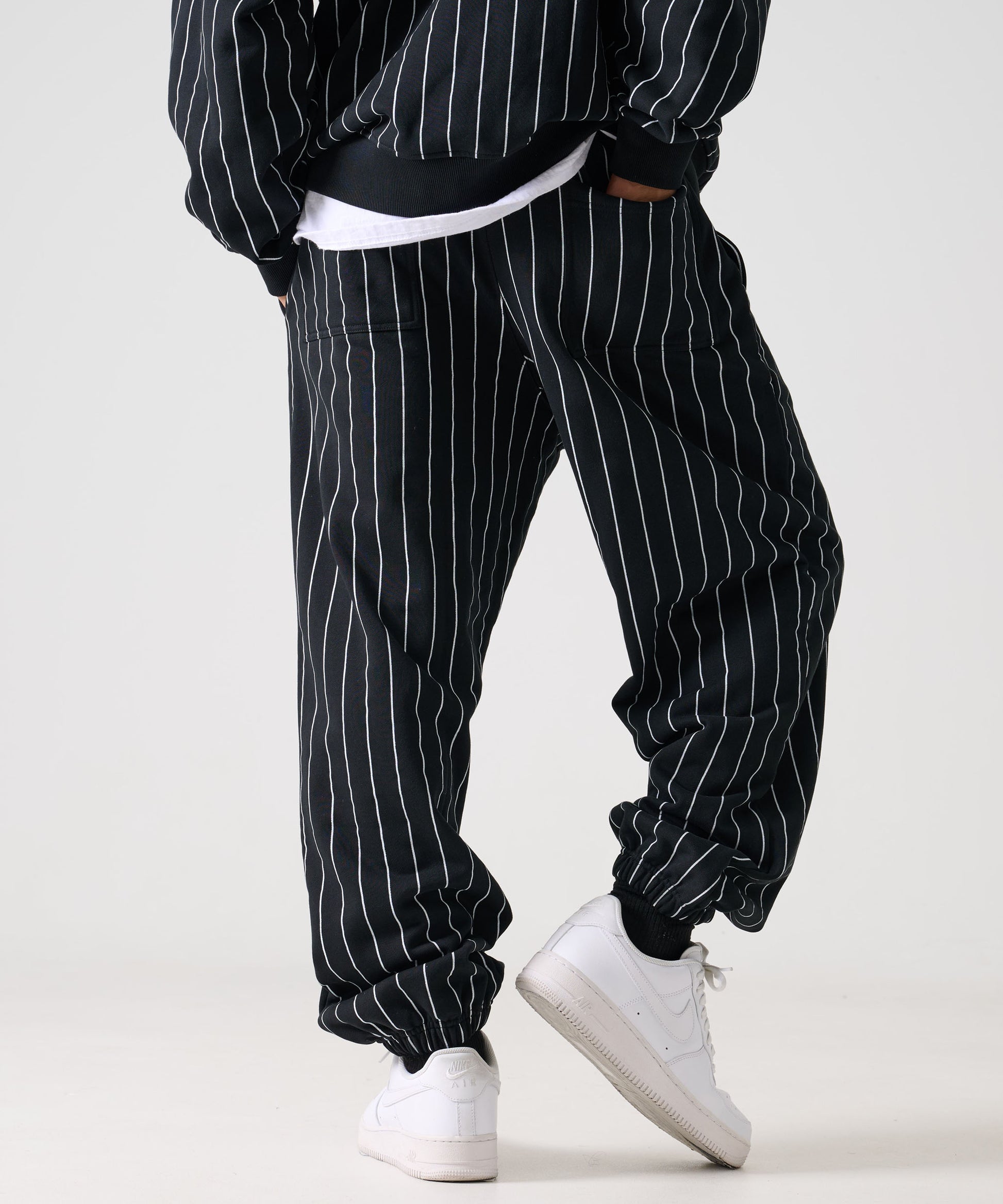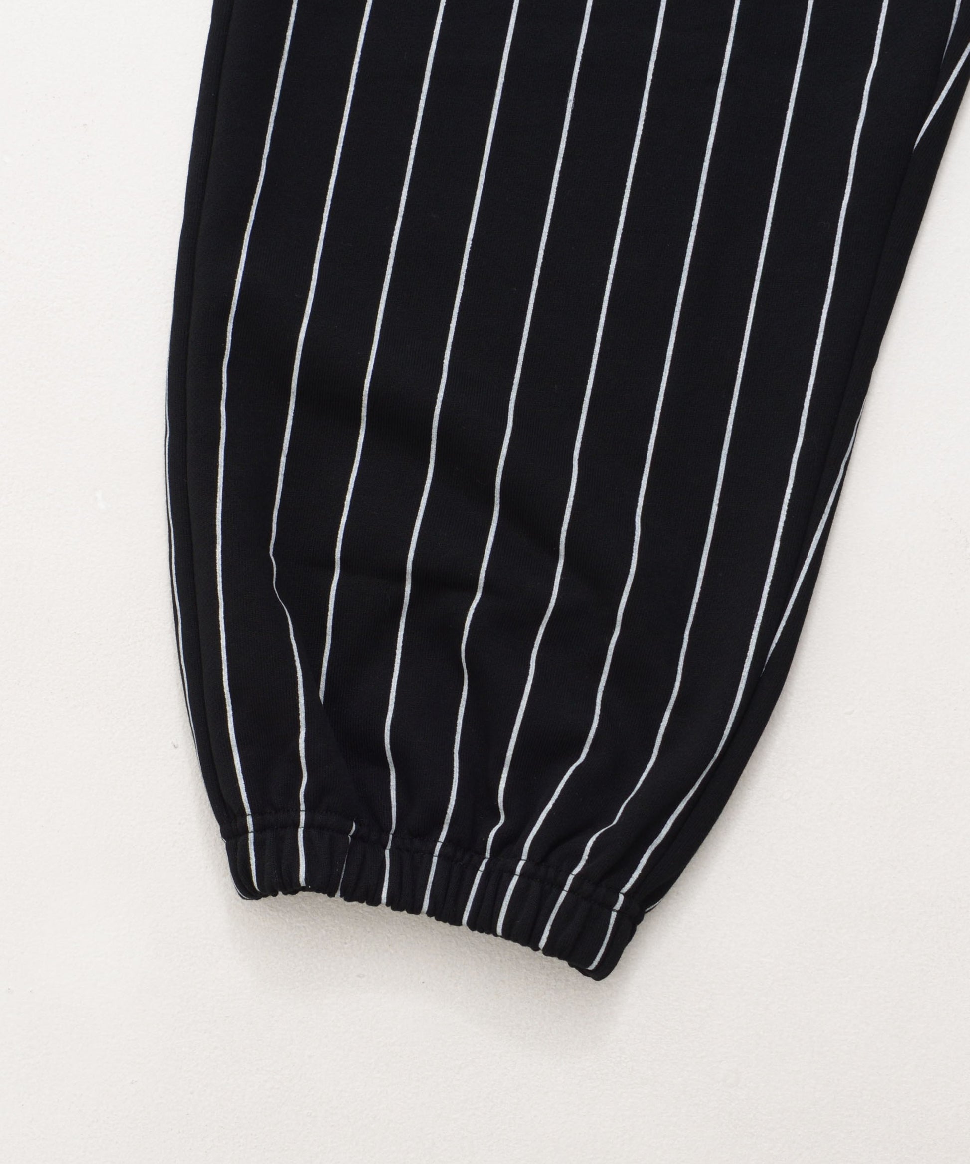FUBUらしいストリート感とクラシックなストライプ柄を組み合わせた、存在感のあるスウェットパンツ。