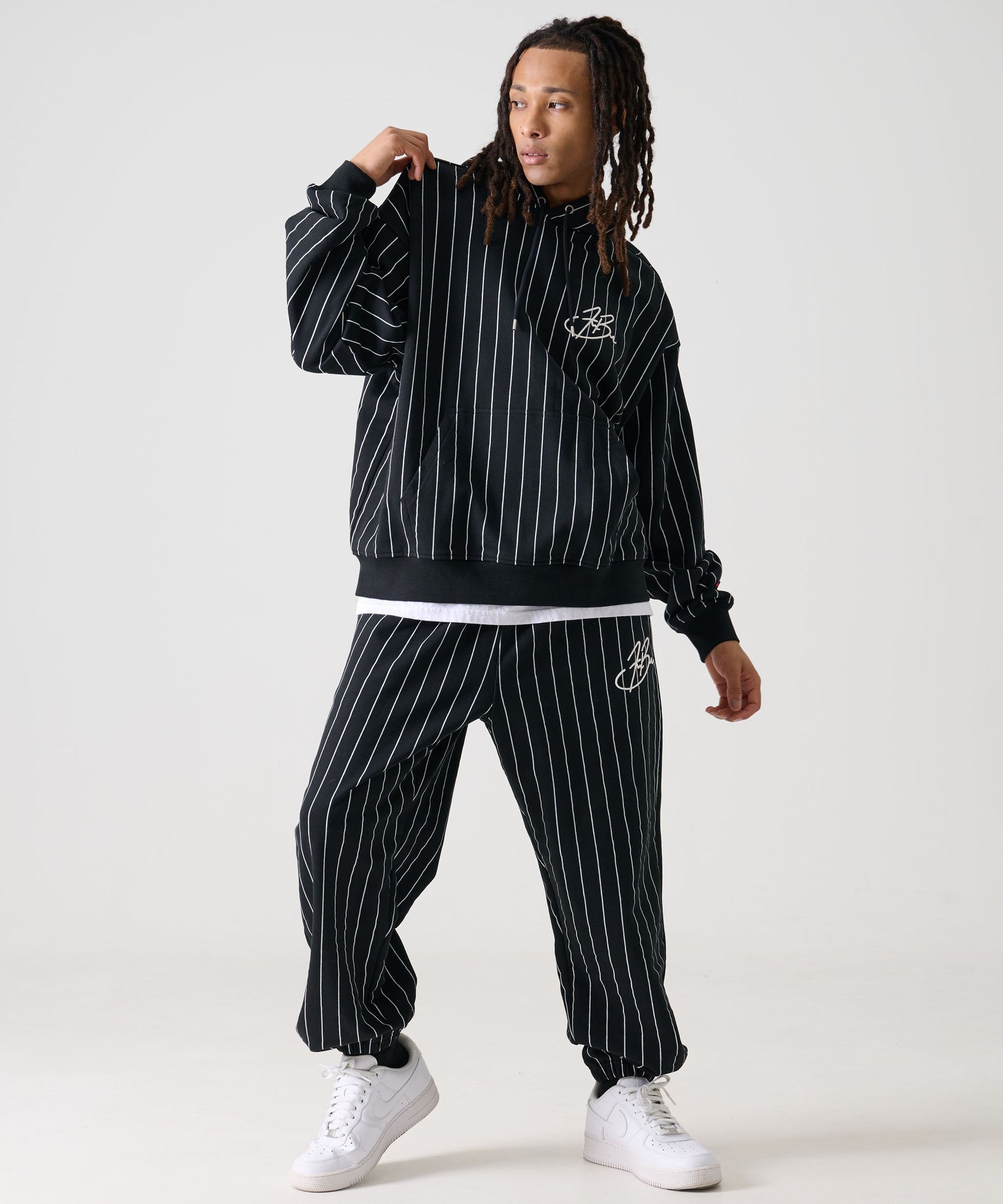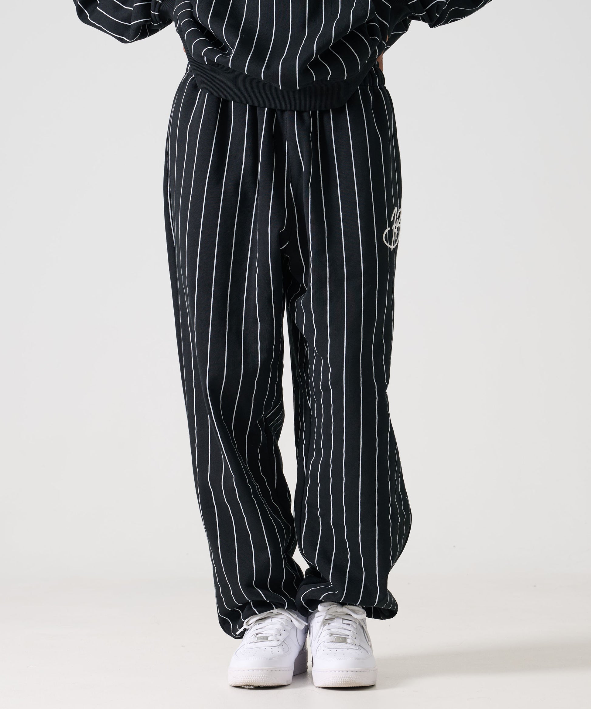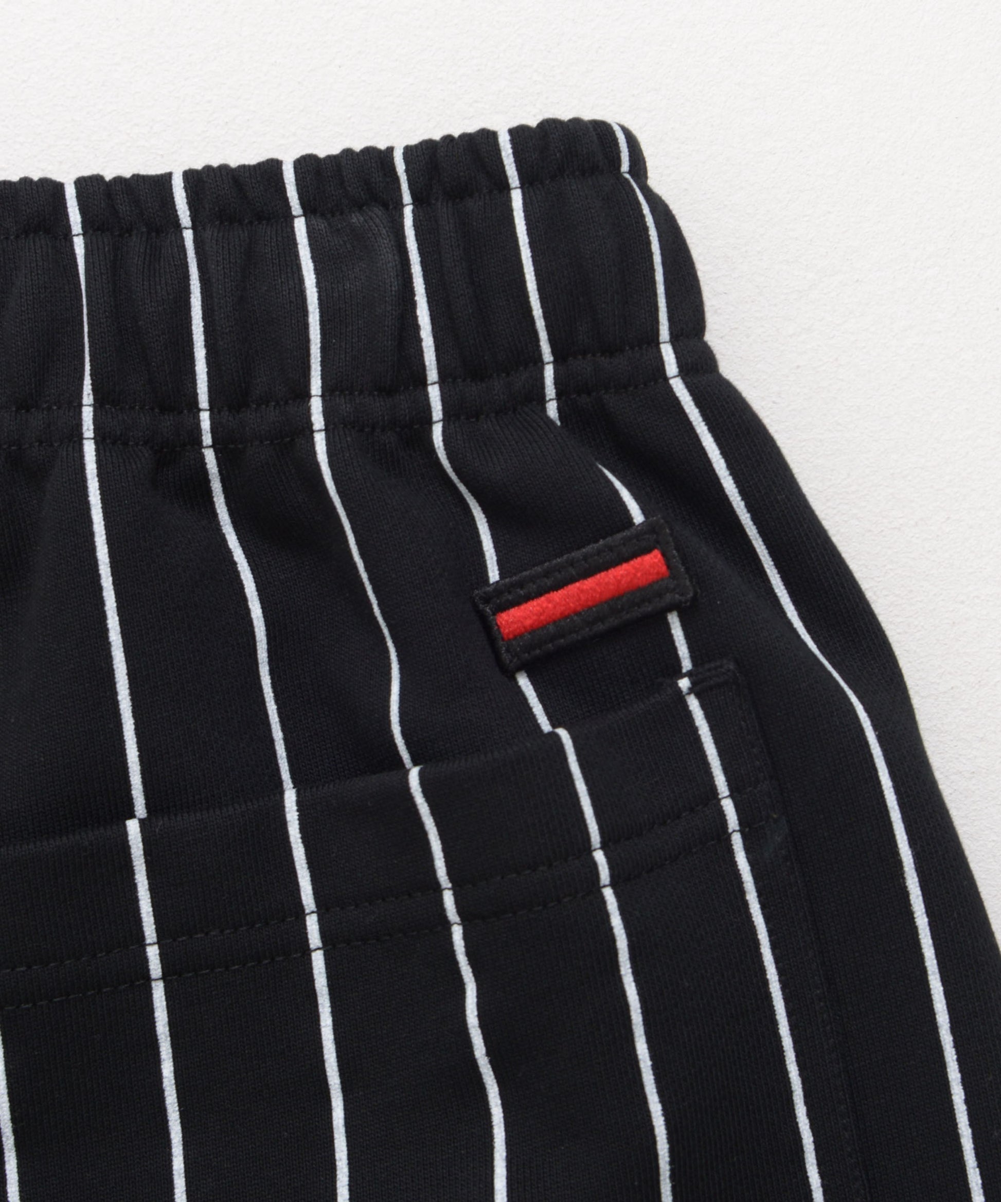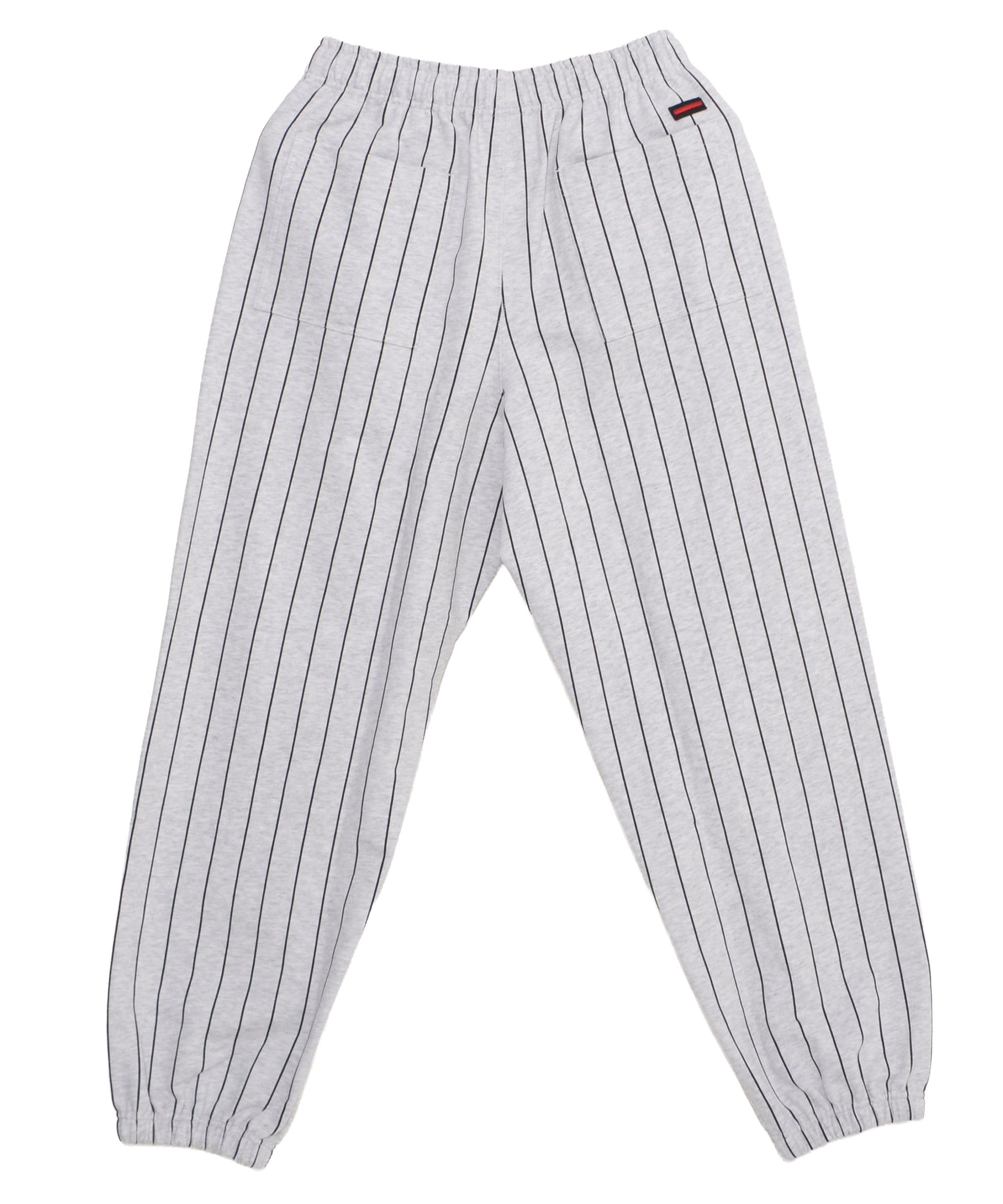 FUBUらしいストリート感とクラシックなストライプ柄を組み合わせた、存在感のあるスウェットパンツ。