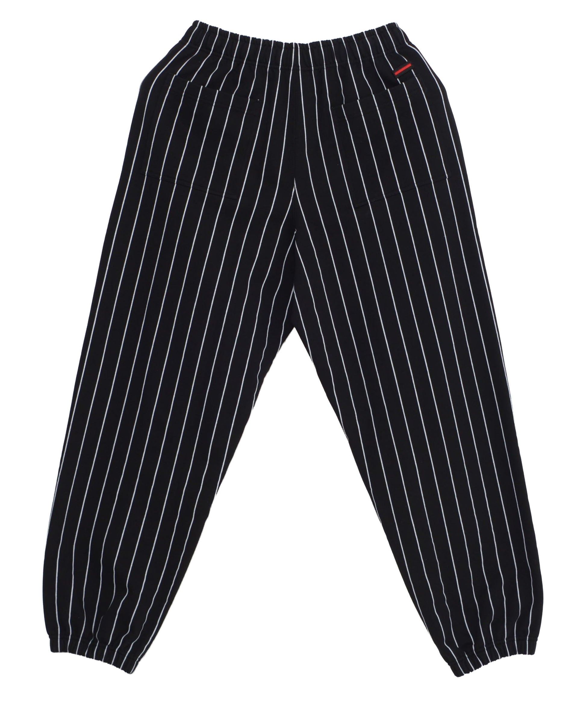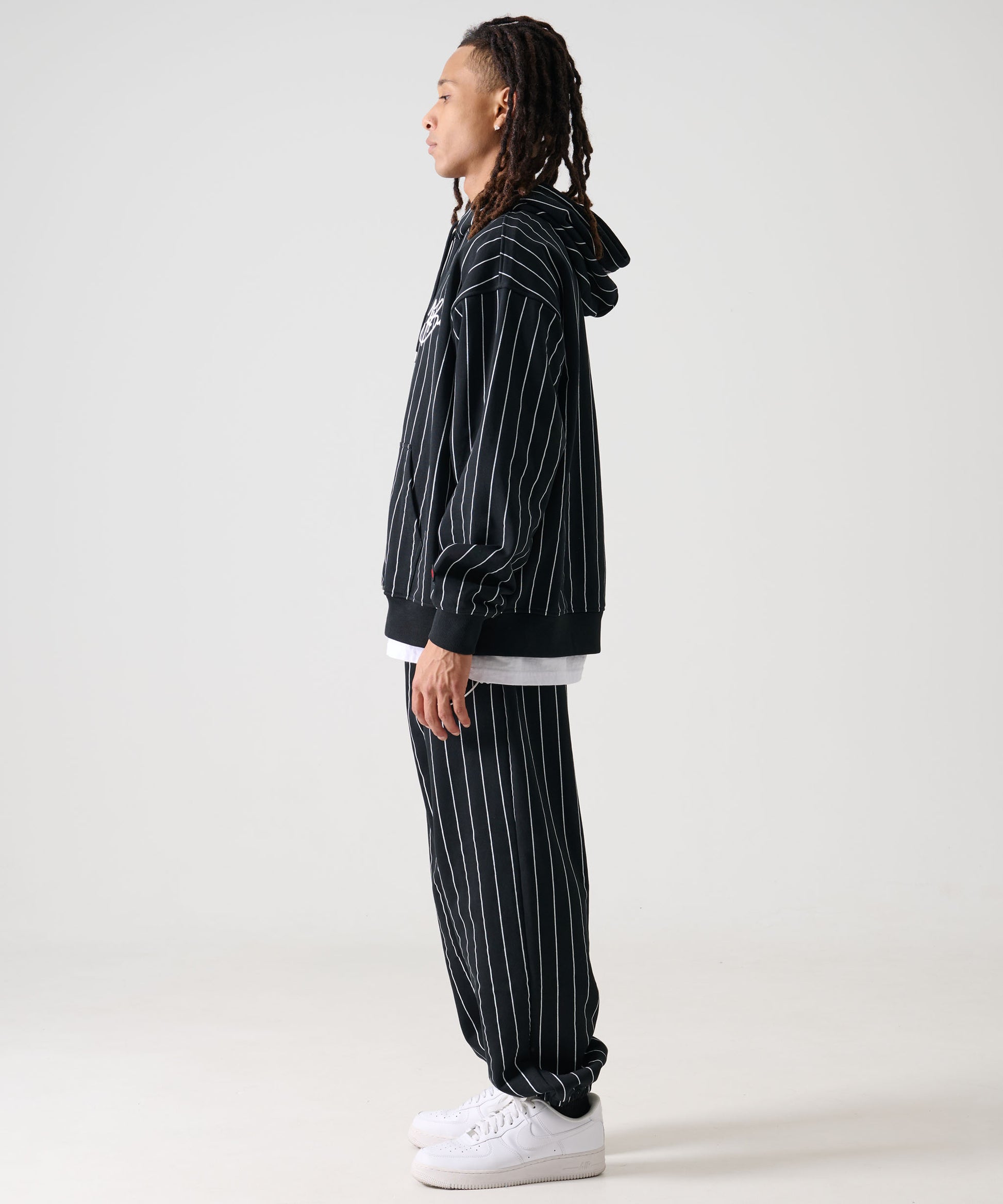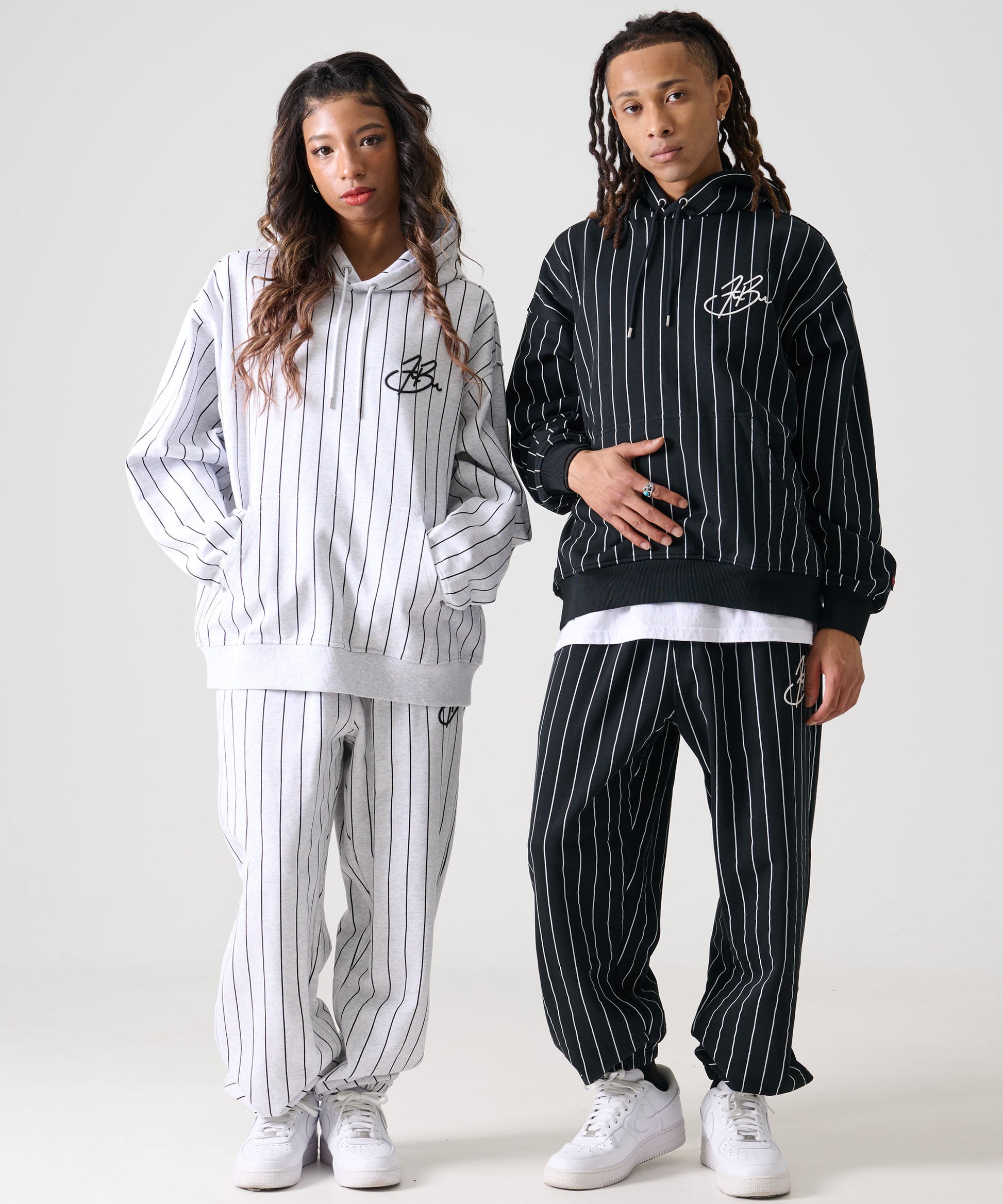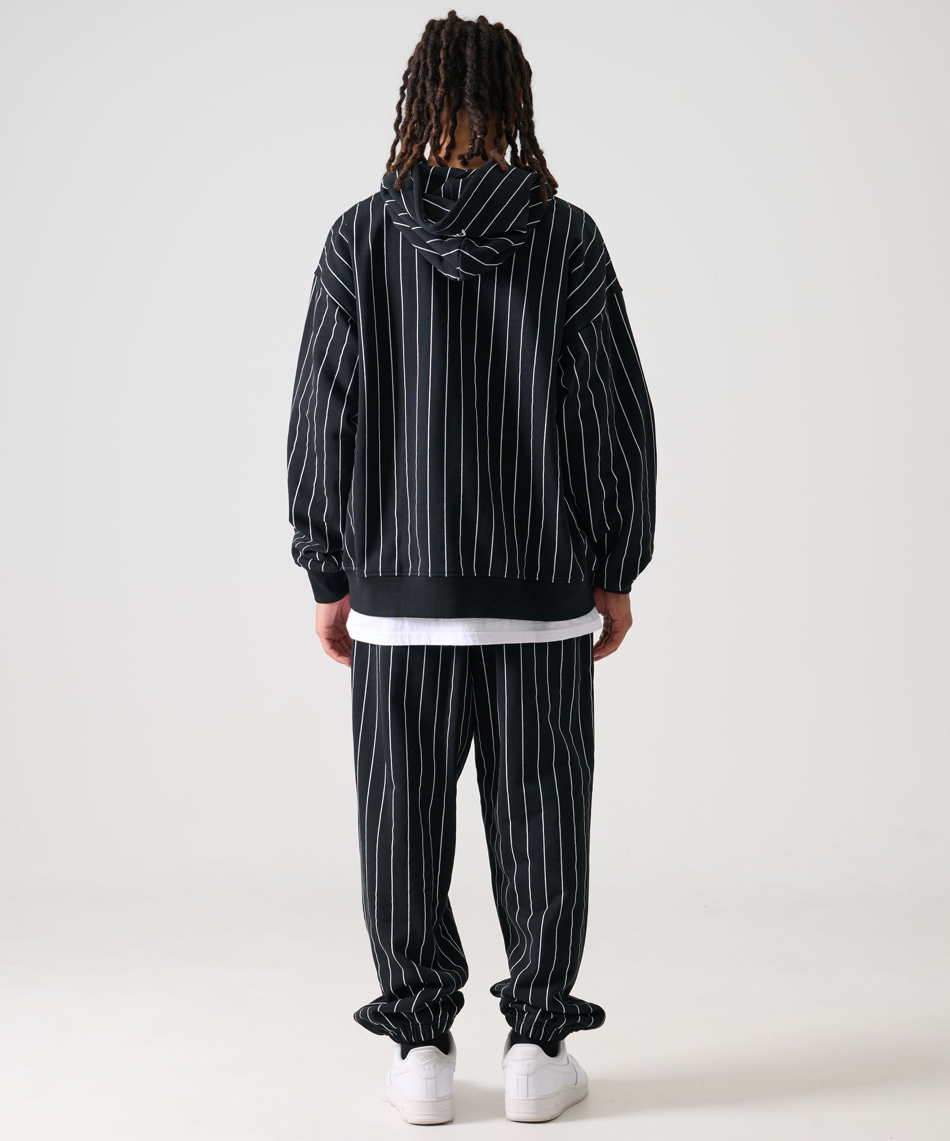 FUBUらしいストリート感とクラシックなストライプ柄を組み合わせた、存在感のあるスウェットパンツ。