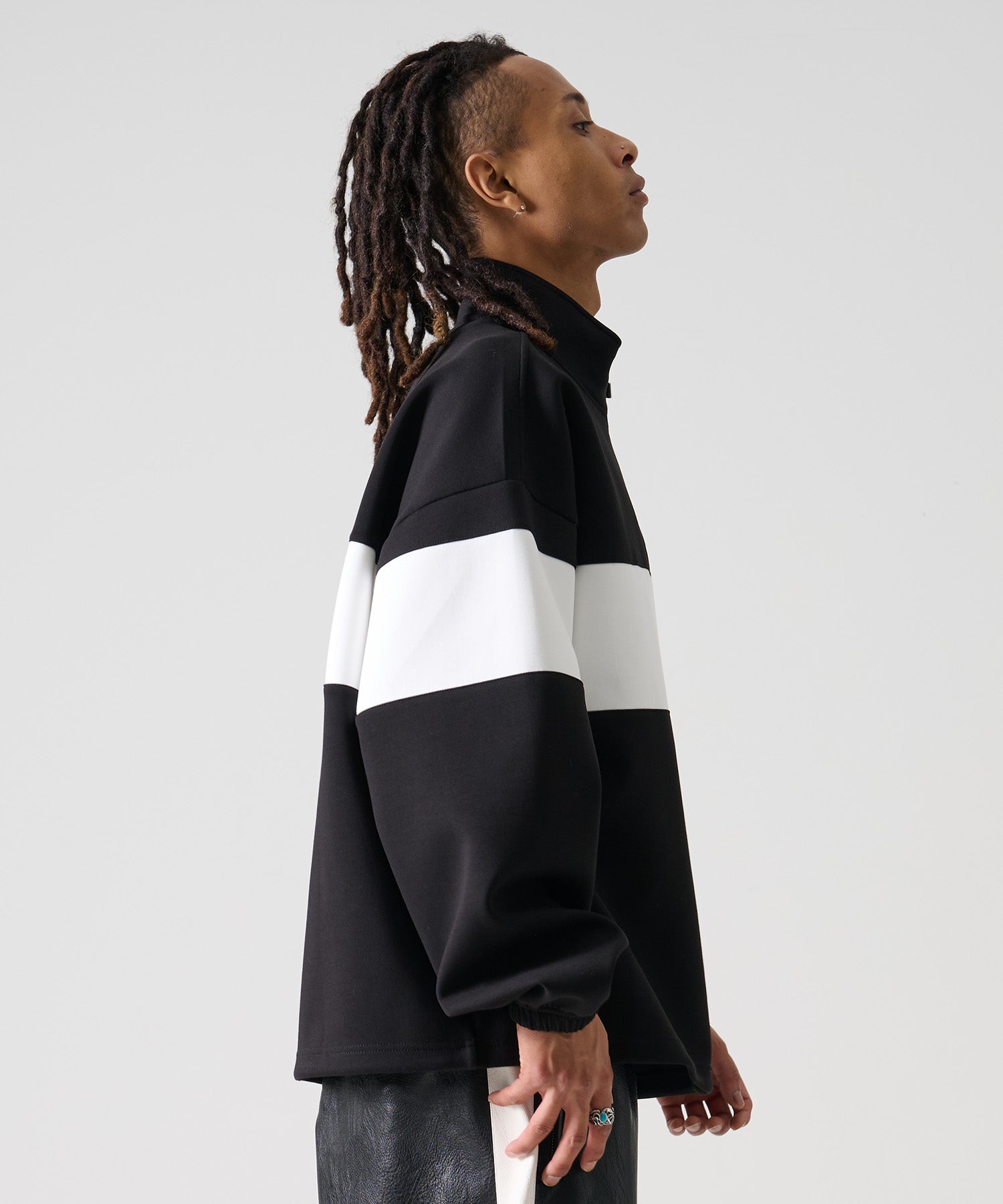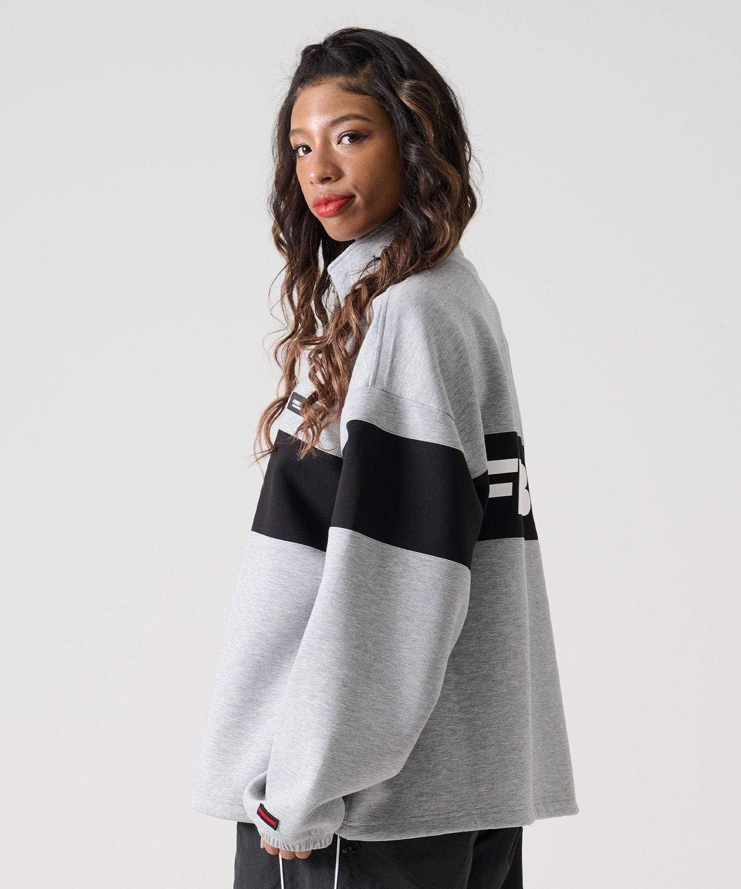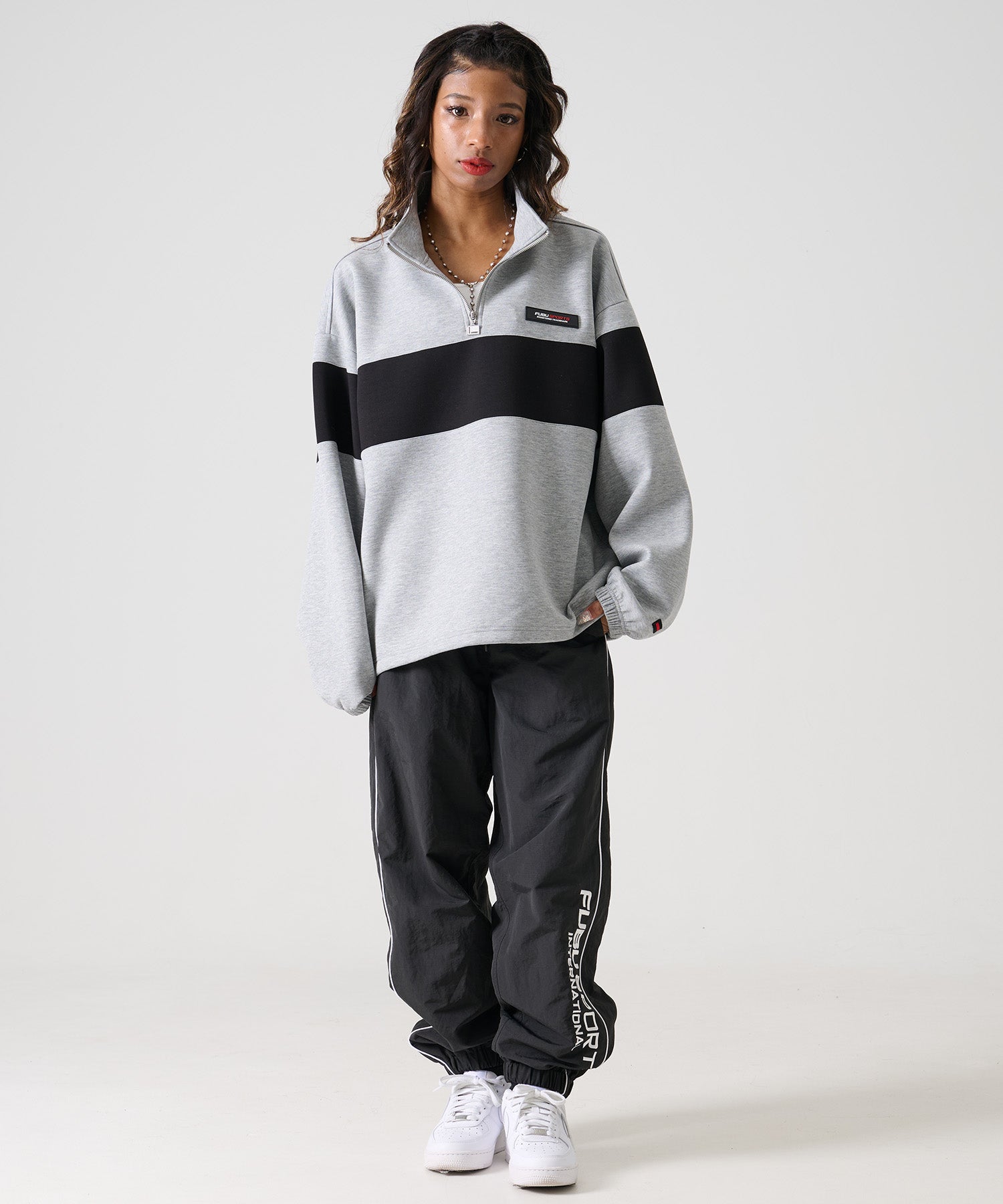大胆な配色切り替えとバックに大きく配置した“FUBU”ロゴが目を惹く、存在感たっぷりのハーフジップトレーナー。ストリートテイストをしっかり感じつつも、クリーンなライン使いとハーフジップが大人っぽさを演出します。