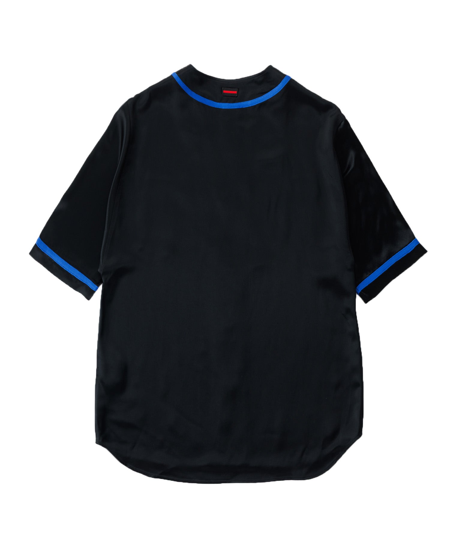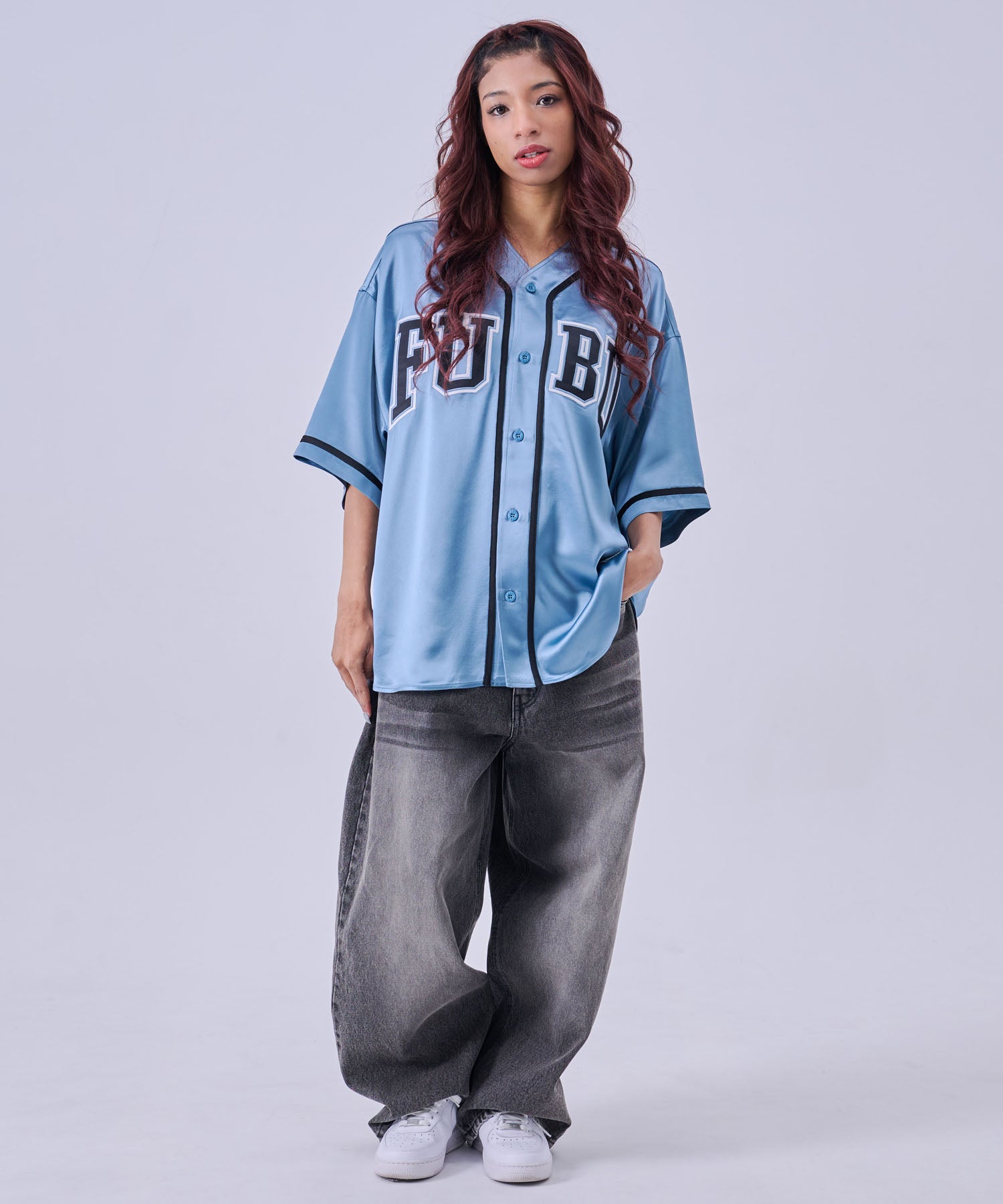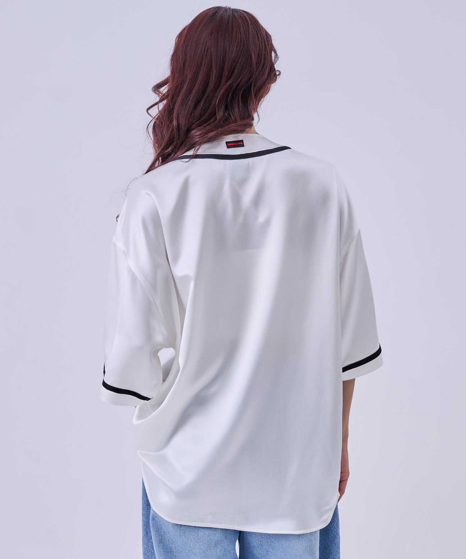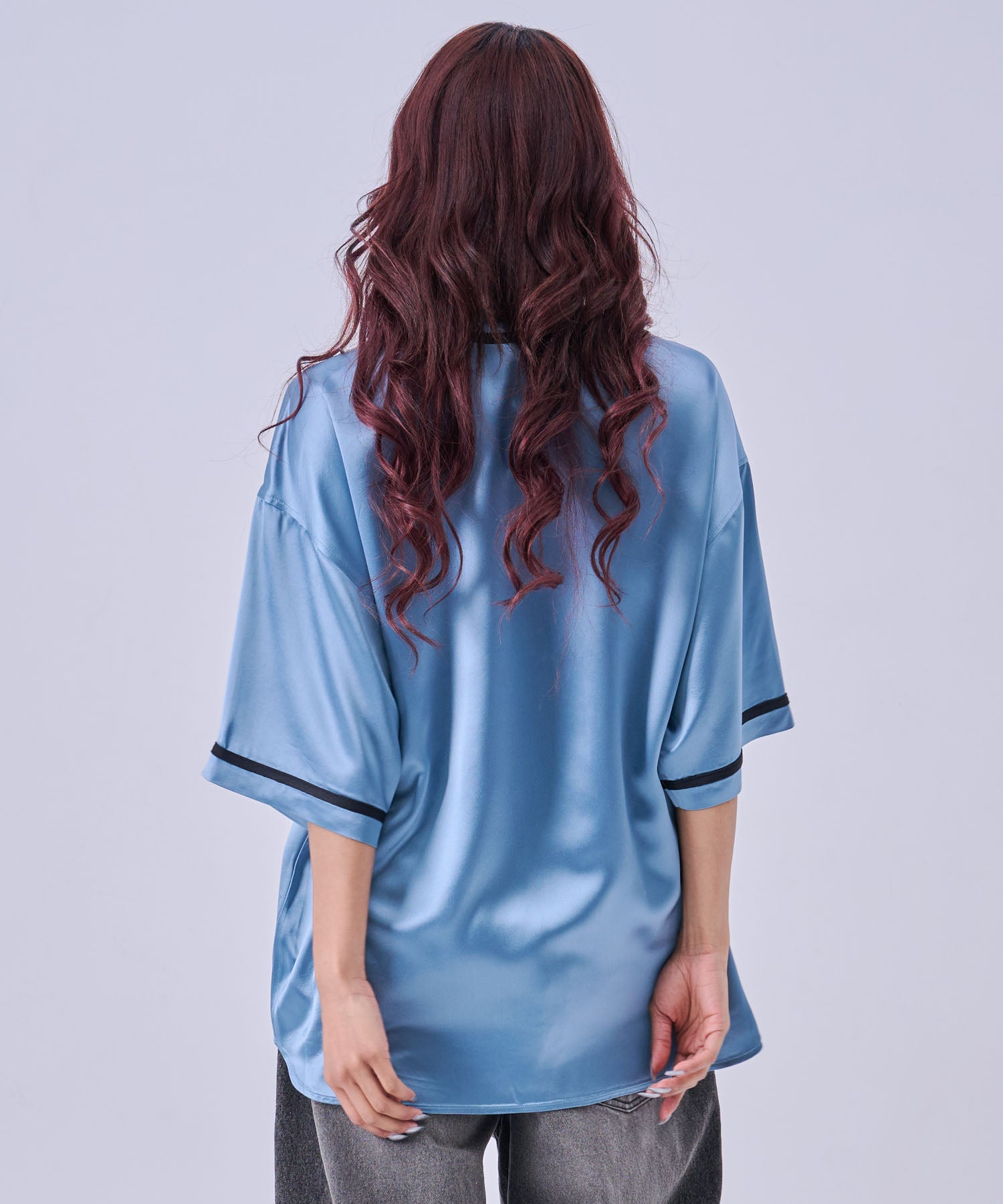 素材は光沢感のあるサテン生地を使用したベースボールシャツ。軽く滑らかな素材感で、ストリートファッションに映える上品な光沢が特徴です。