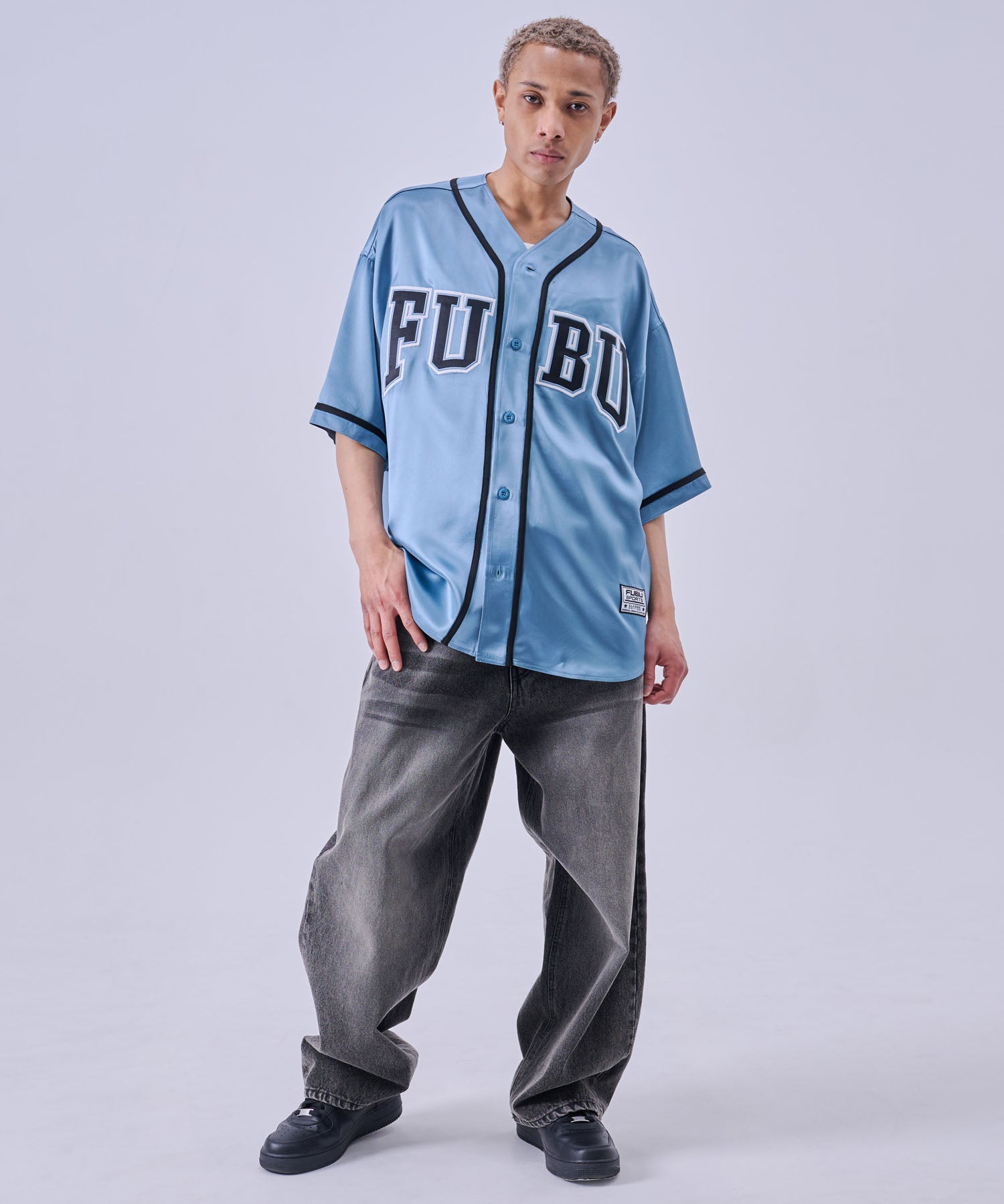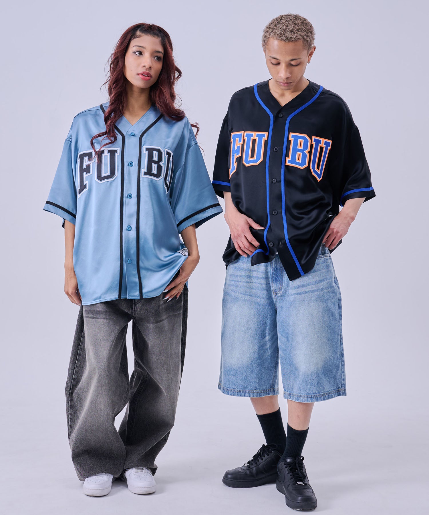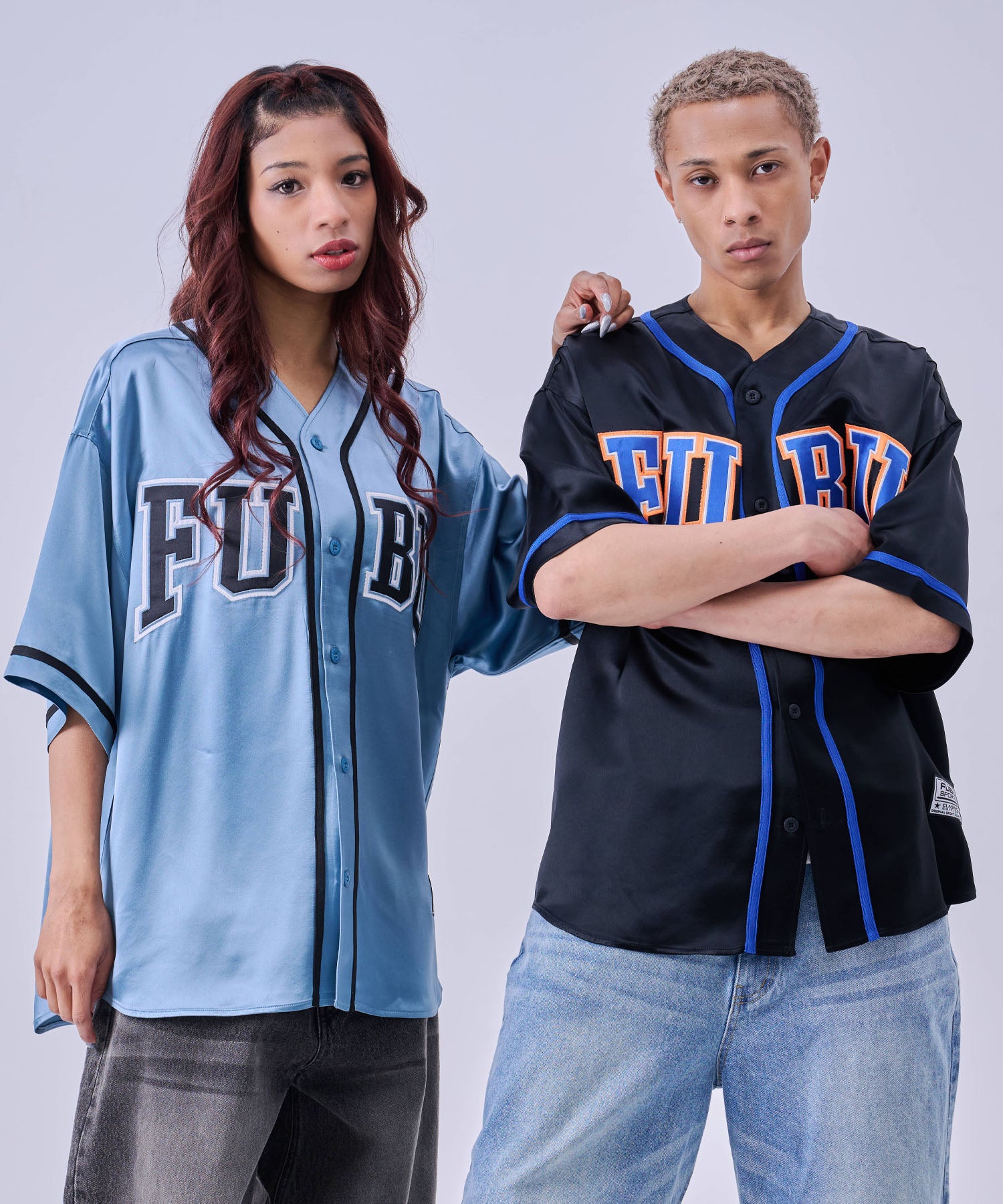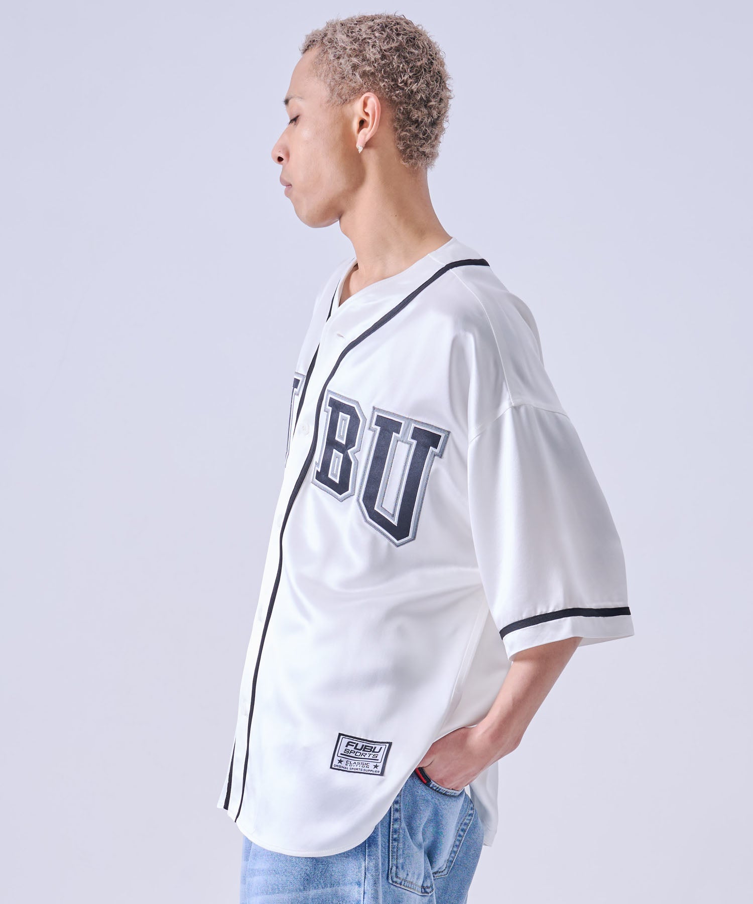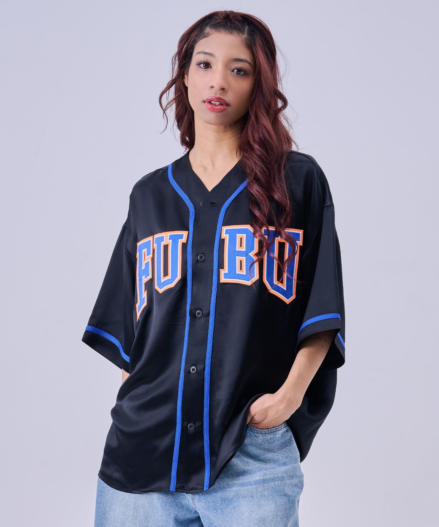 素材は光沢感のあるサテン生地を使用したベースボールシャツ。軽く滑らかな素材感で、ストリートファッションに映える上品な光沢が特徴です。