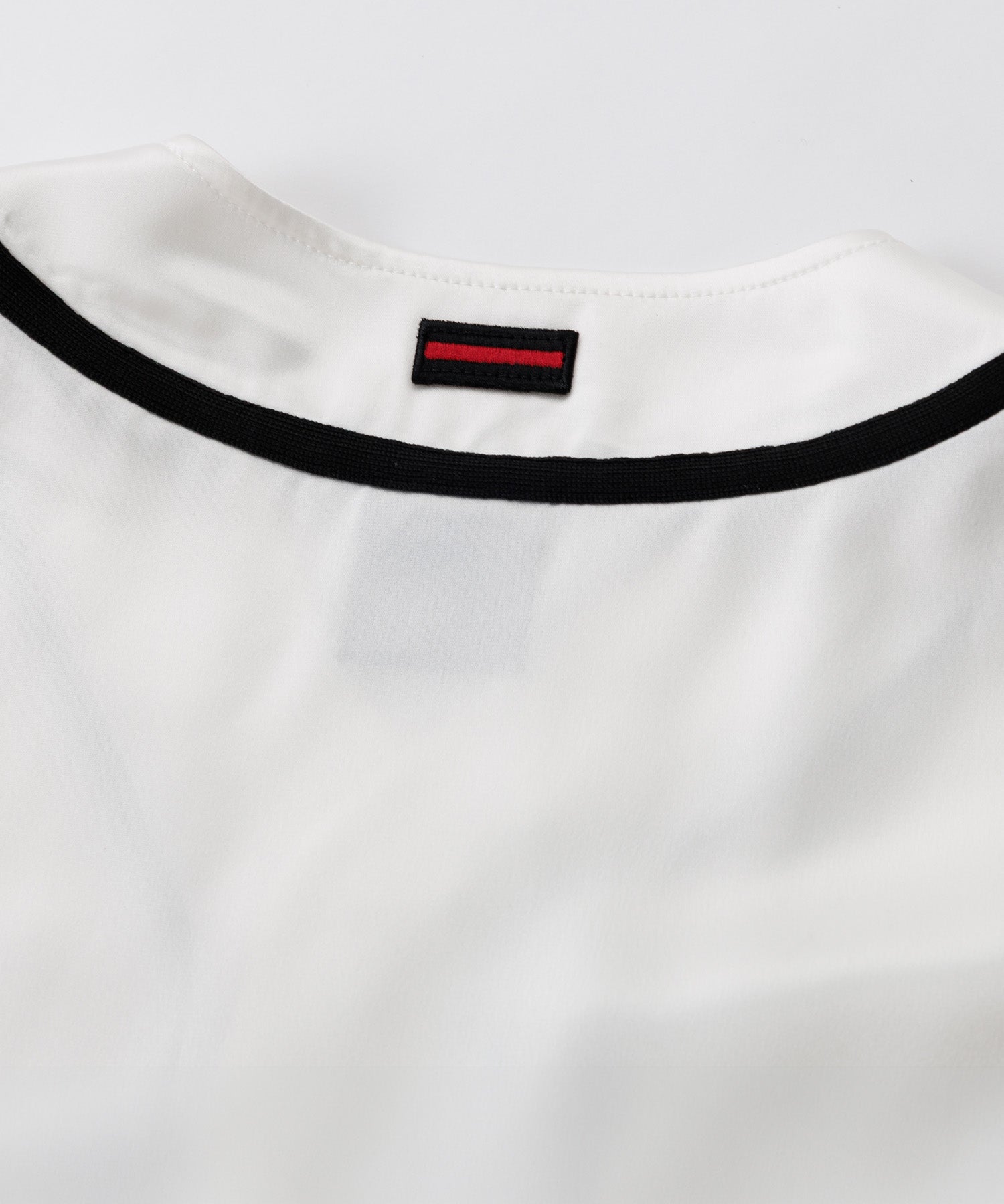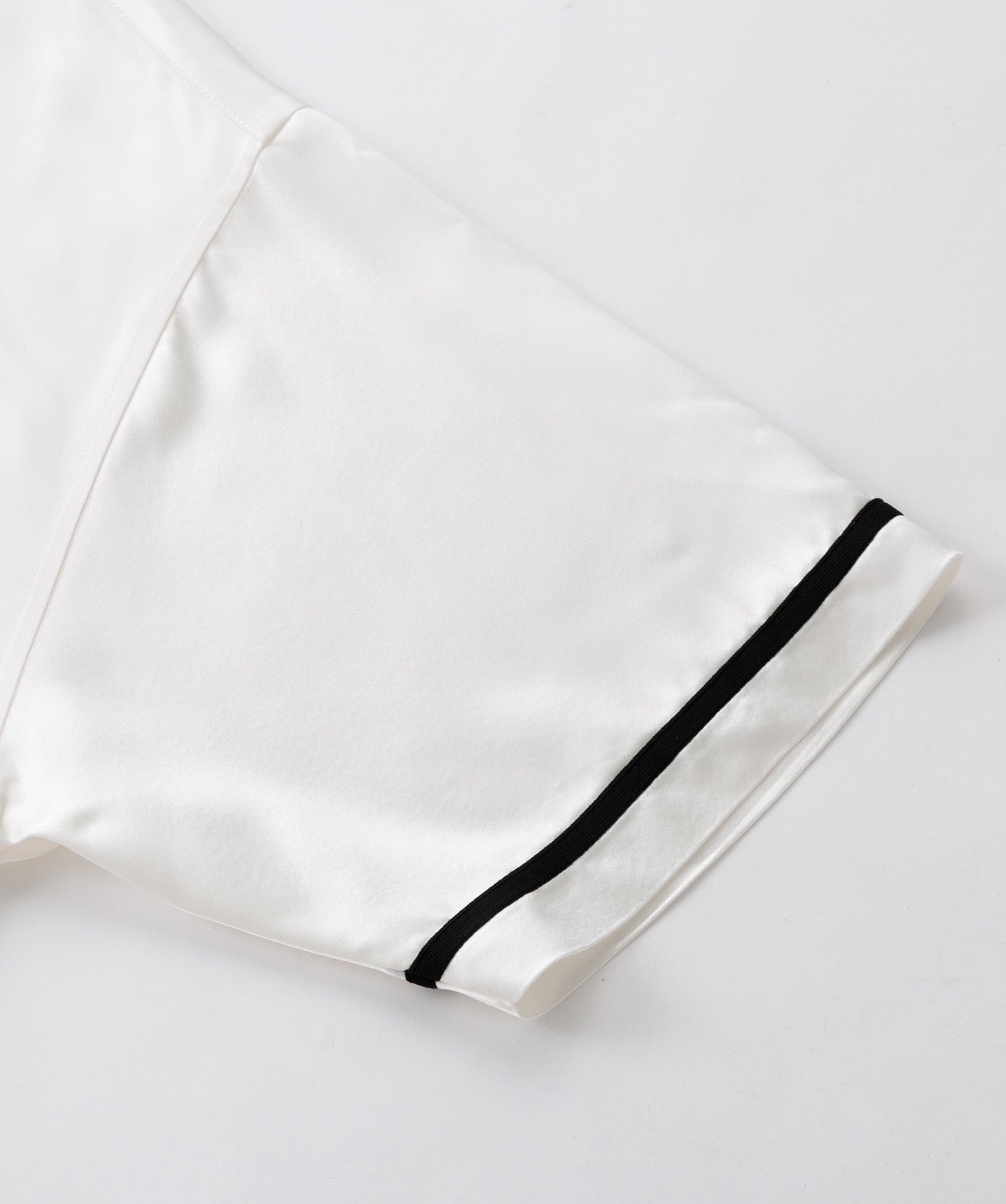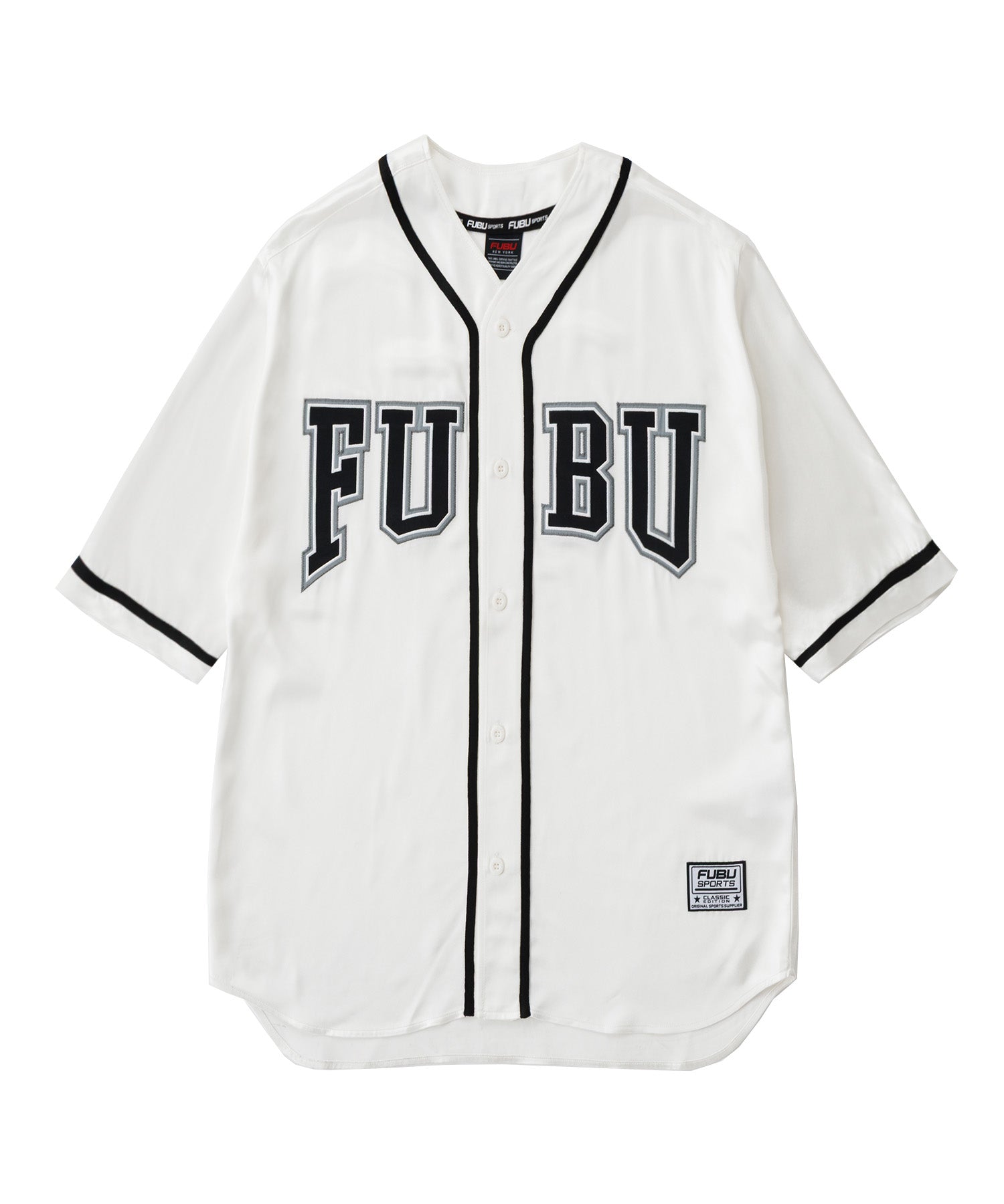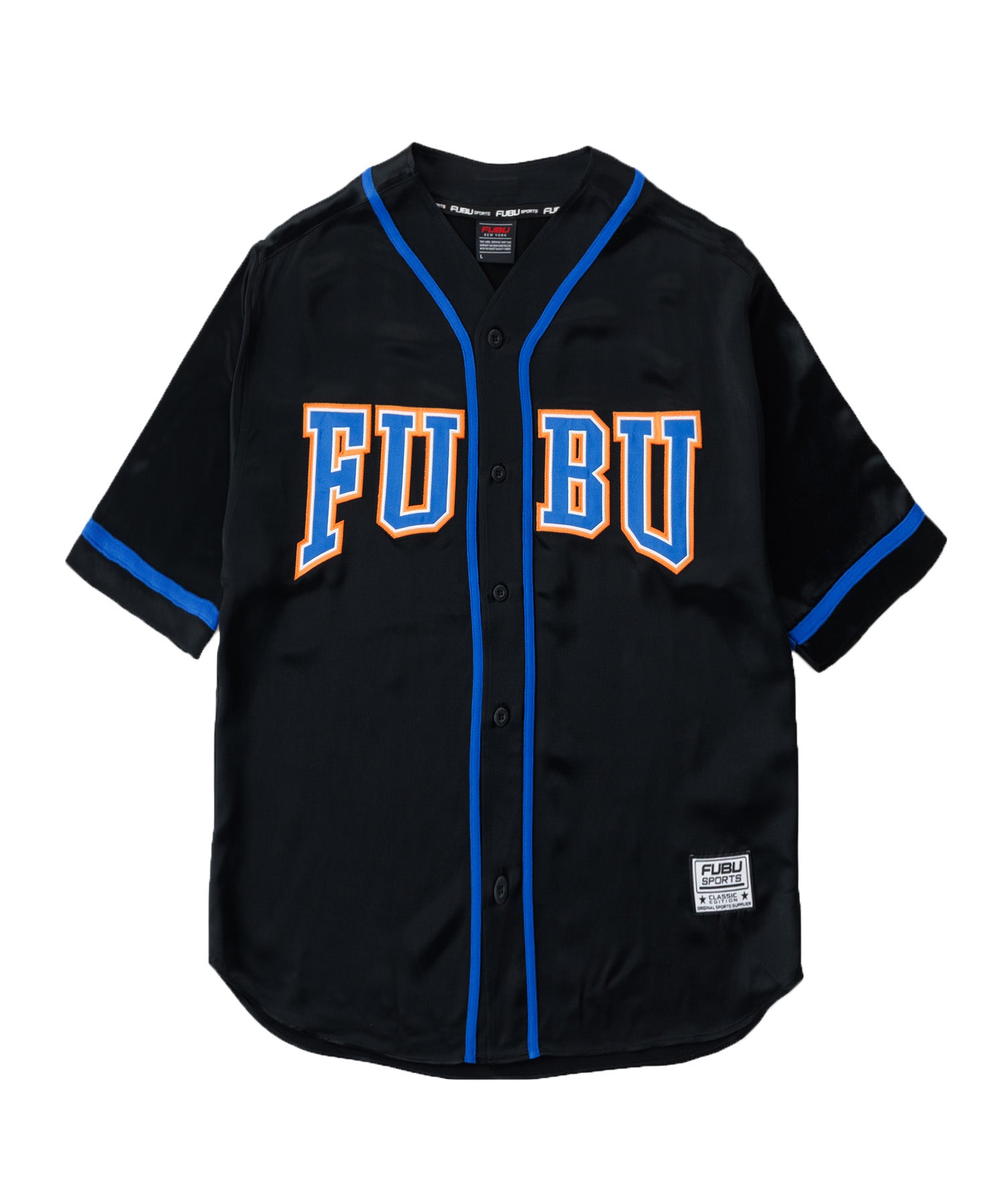 素材は光沢感のあるサテン生地を使用したベースボールシャツ。軽く滑らかな素材感で、ストリートファッションに映える上品な光沢が特徴です。