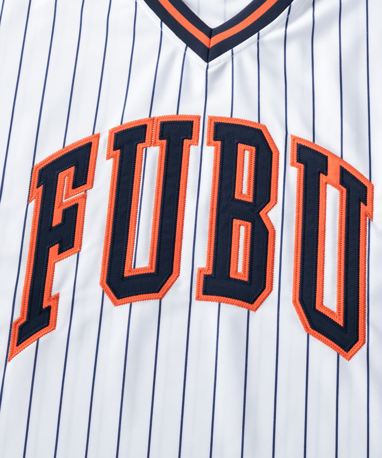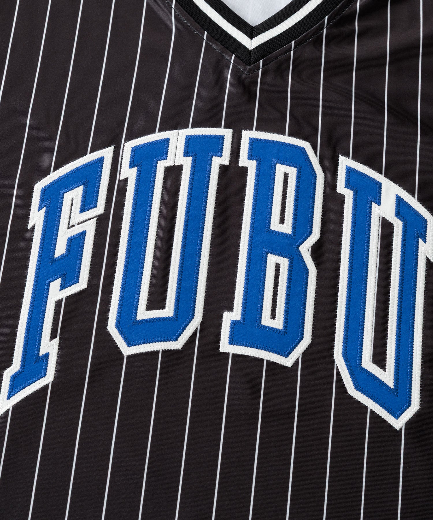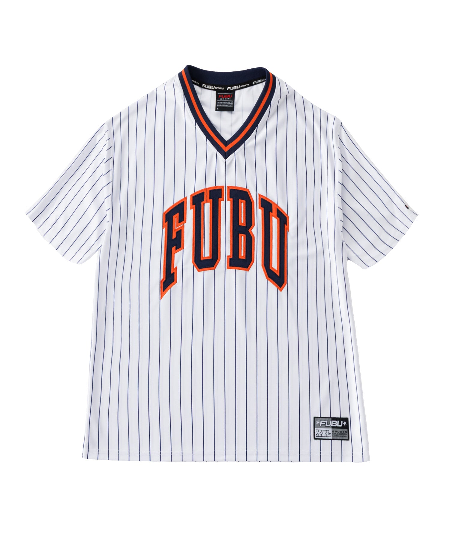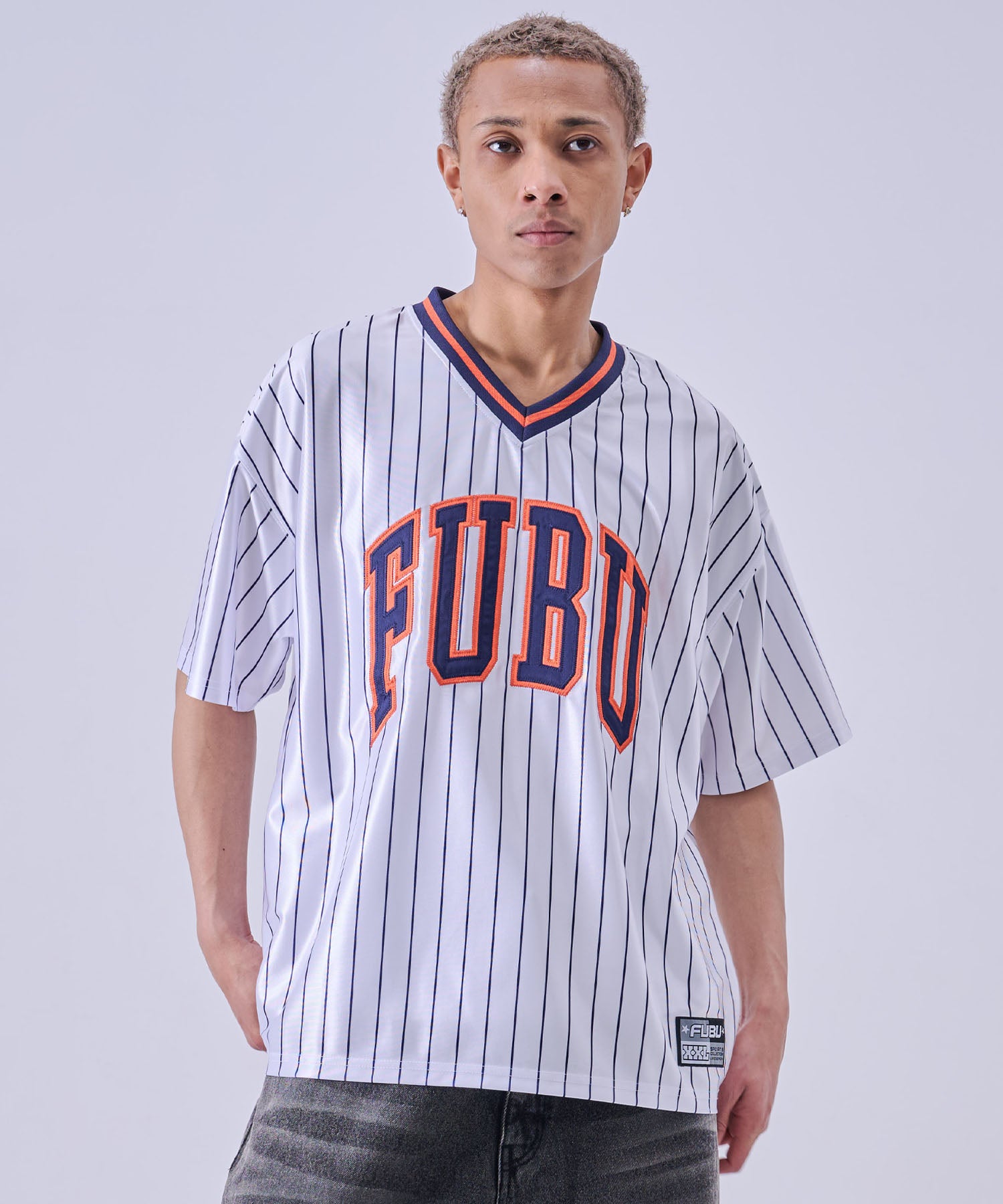 ・フロントに大胆な FUBUロゴ を配置したストリートデザイン。スポーツユニフォームをイメージした Vネック仕様 とストライプ柄が、ストリートとスポーツを融合したスタイルを演出します。