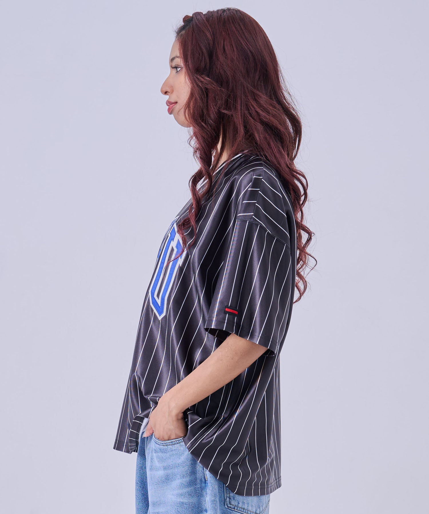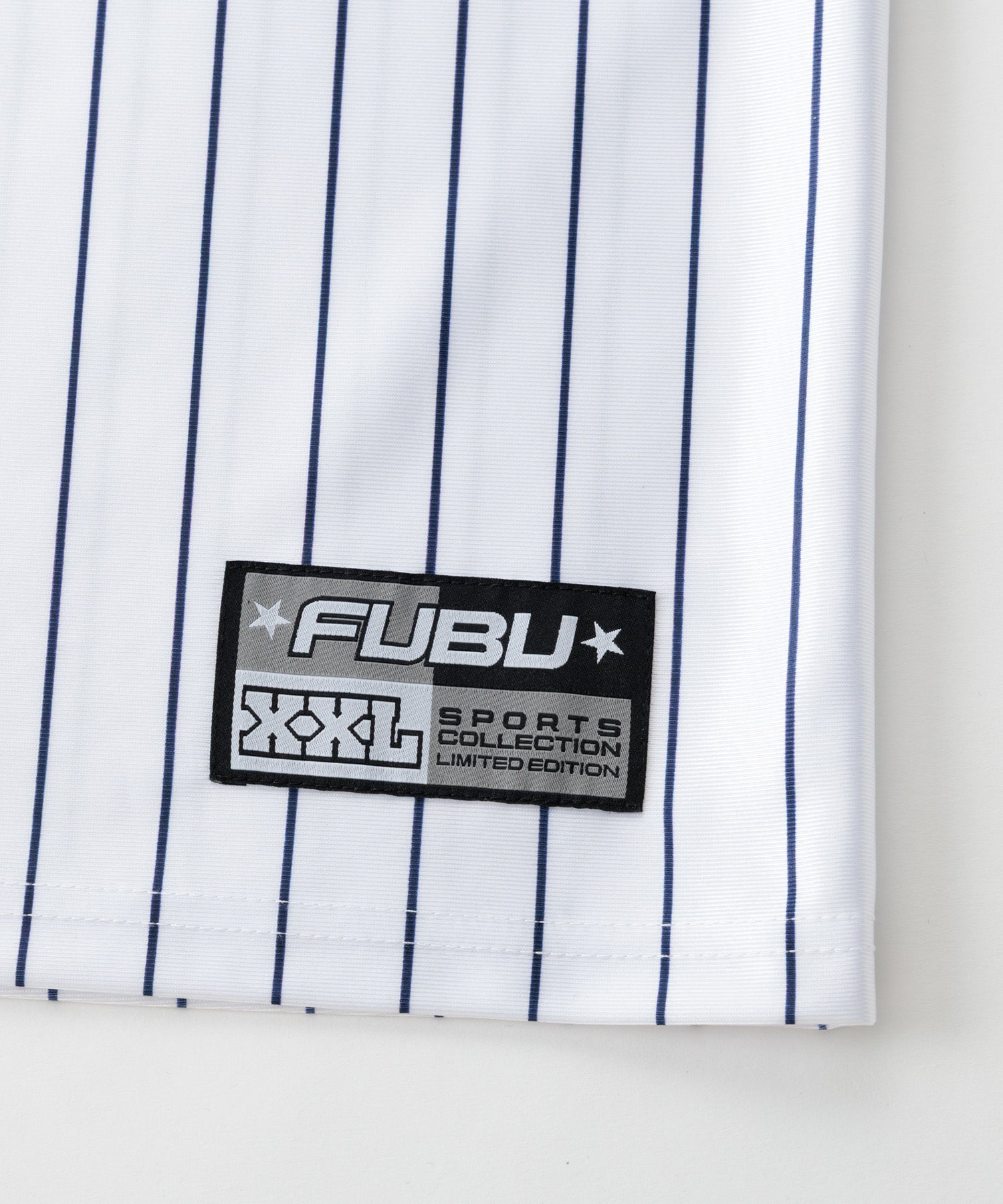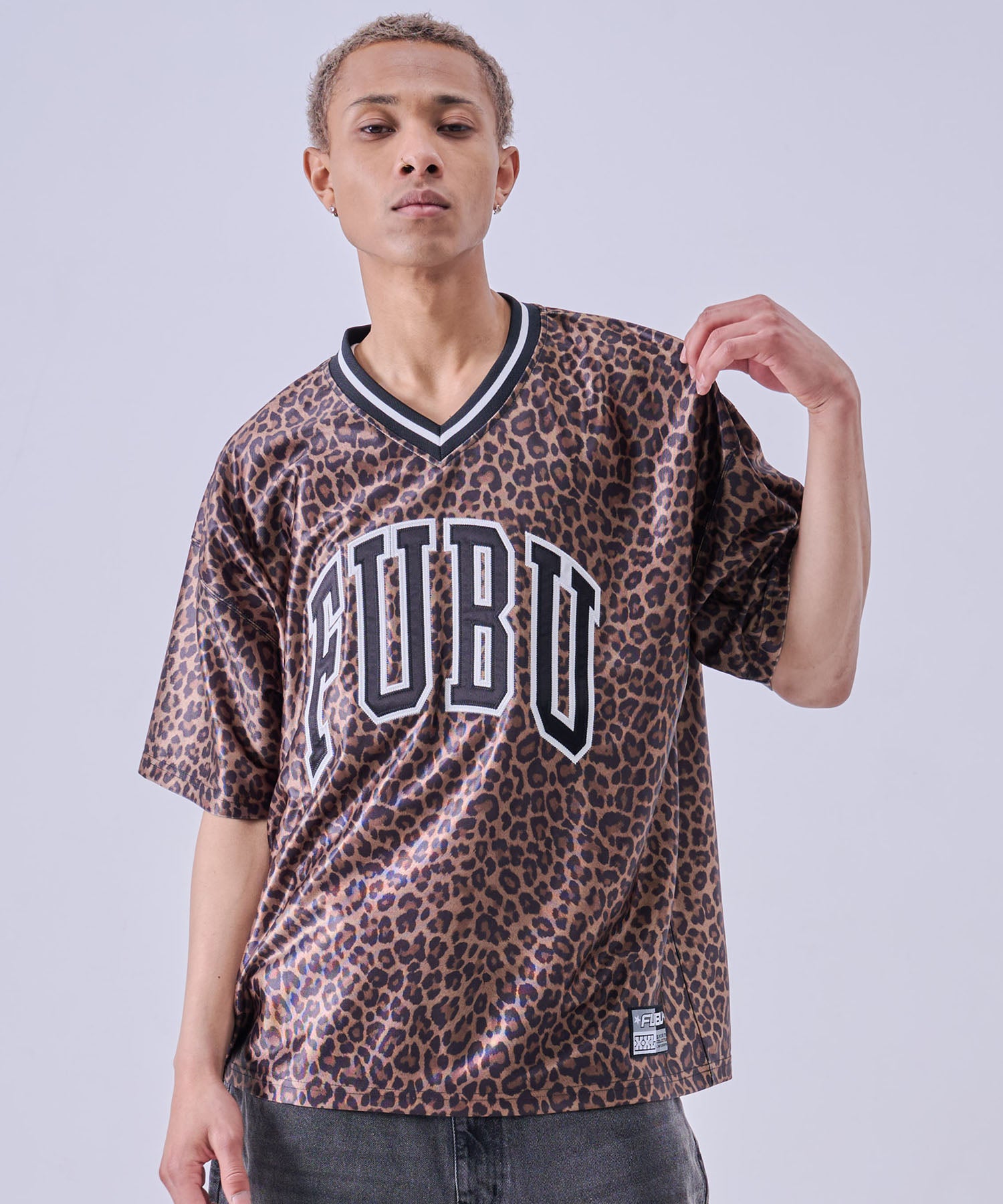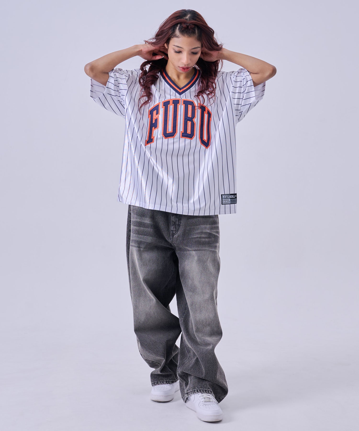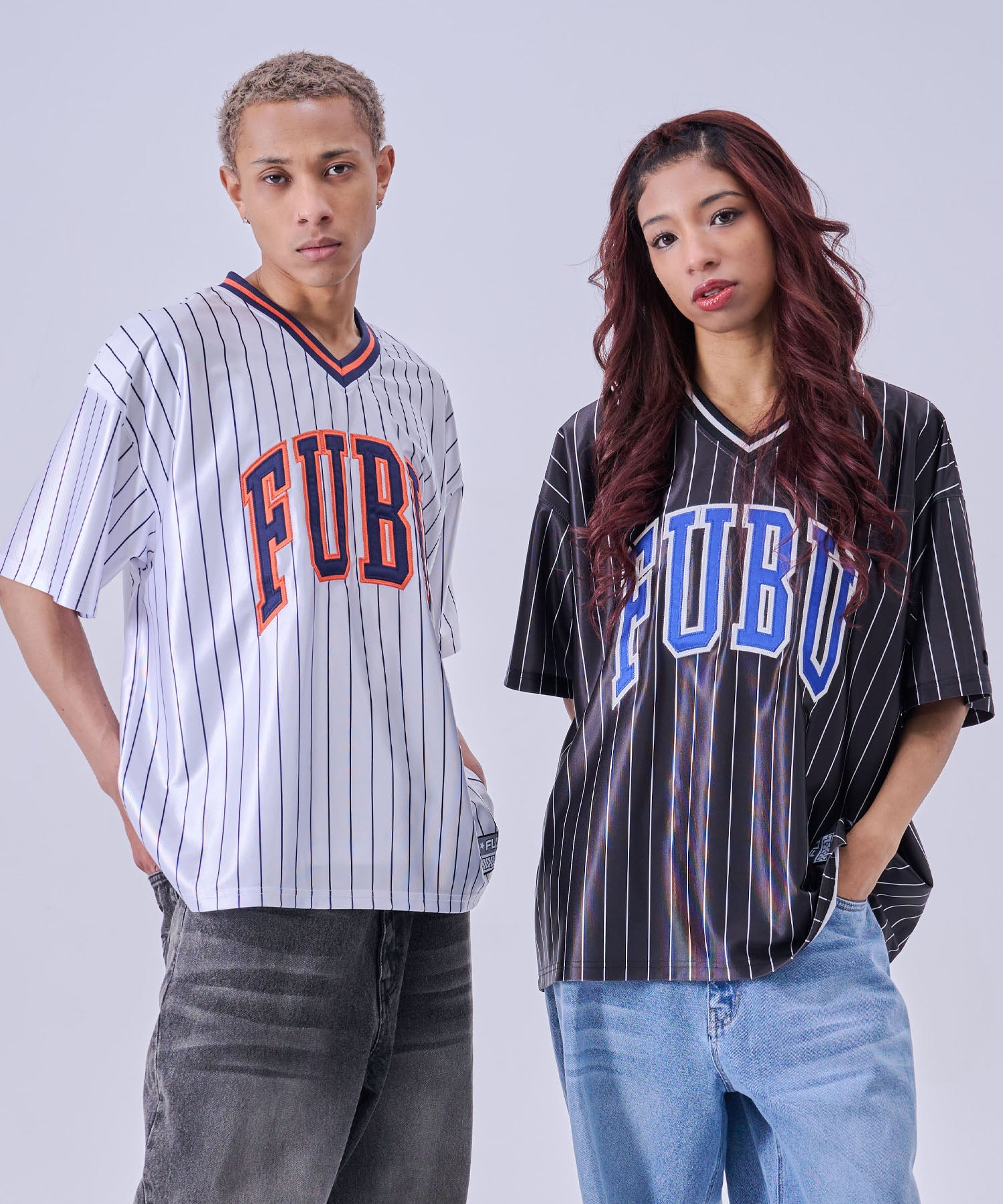 ・フロントに大胆な FUBUロゴ を配置したストリートデザイン。スポーツユニフォームをイメージした Vネック仕様 とストライプ柄が、ストリートとスポーツを融合したスタイルを演出します。